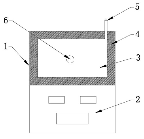 如圖所示:一種稀土三其色熒光粉燒結(jié)實驗爐,包括加熱爐體1和系統(tǒng)控制區(qū)2,加熱爐體1位于系統(tǒng)控制區(qū)2的上方,下側(cè)的系統(tǒng)控制區(qū)2內(nèi)設(shè)有各種儀表、流量計等用來控制加熱爐體1內(nèi)的溫度和氣氛等各種情況,并實時監(jiān)控加熱爐體1內(nèi)的各項參數(shù)變化情況;加熱爐體1由爐膛3和構(gòu)成爐膛3的保溫爐殼4組成,其中爐膛3為箱式腔體,在保溫爐殼4的頂部設(shè)有與爐膛3連通的點(diǎn)火嘴5;保溫爐殼4的背部設(shè)有與爐膛3連通的進(jìn)氣口6,該進(jìn)氣口6位于爐膛3的后壁上,通過進(jìn)氣口6通入氫氣作為材料燒結(jié)時使用的燃料。